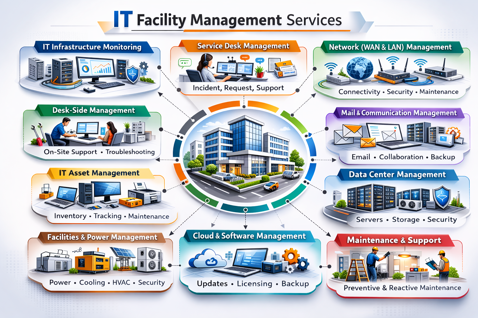 IT Facilities Management Services from UFTech involve an effective combination of people, process and tools to ensure that your IT infrastructure is always up and running. Catering to the 24x7 service demands, we undertake complete responsibility of ensuring availability and performance of your IT Infrastructure.